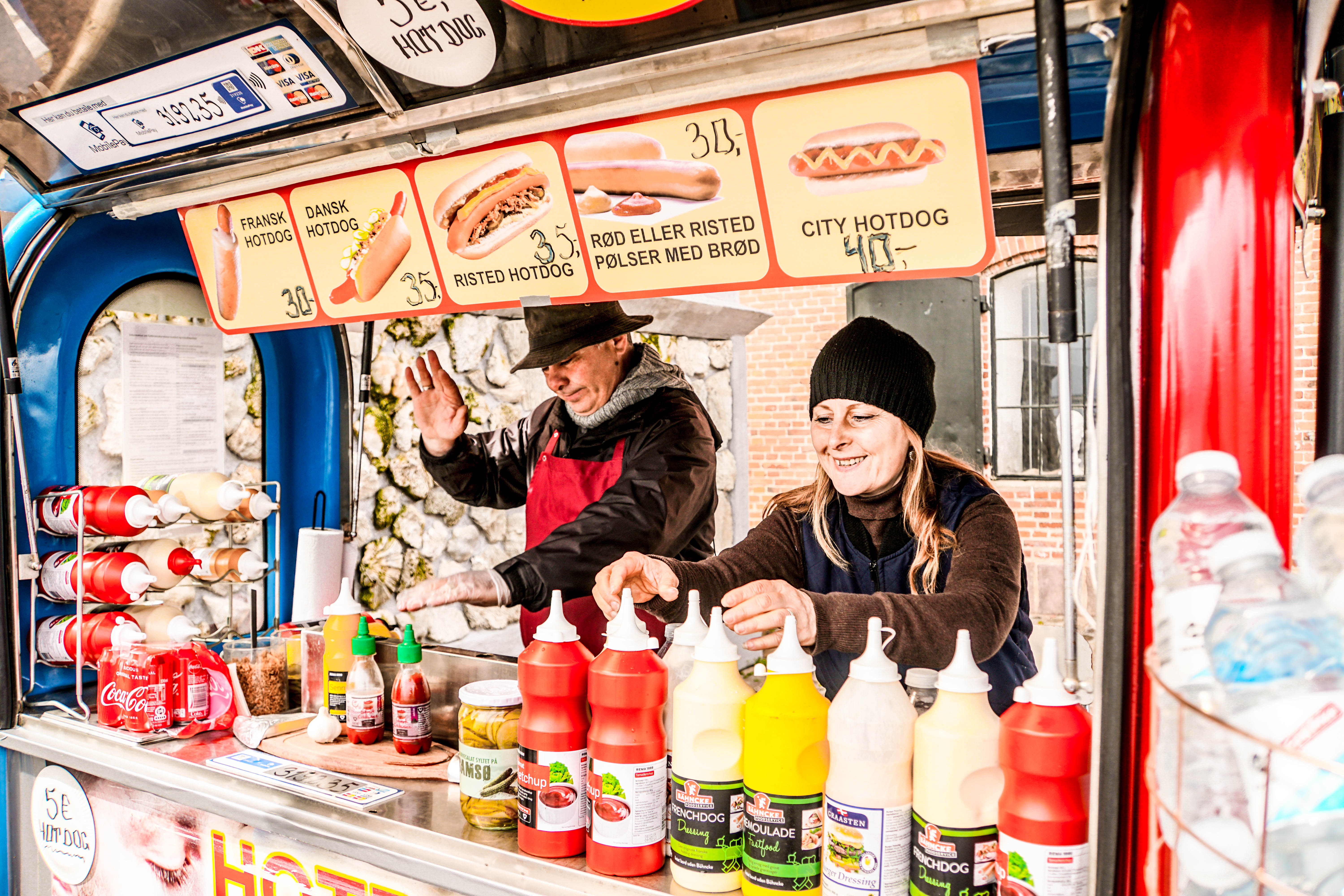 在路上會看到很多熱狗攤販,價錢大概五歐,因為我全程都沒有換匯,所以都只挑有卡可以刷的地方,在英國幾乎每個地方都可以刷卡,所以我想這麼高發展中的國家不用過度擔心貨幣問題,但小攤販我就會稍微留意一下能不能刷卡了,我買的這家願意收歐元,我就也放心的買了有名的丹麥熱狗吃吃看,不知道為什麼有名就是了XDDD