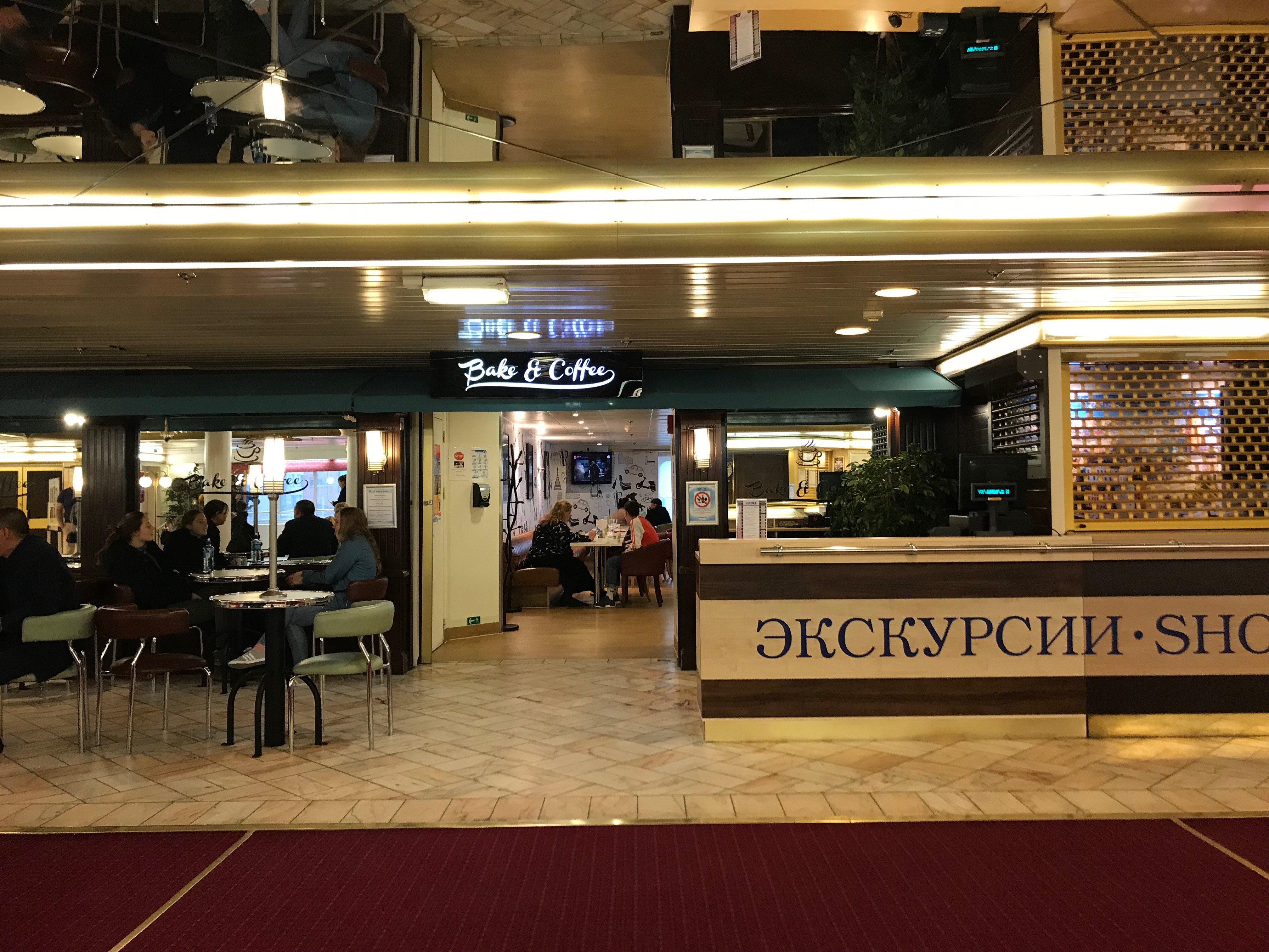 但就算是這樣,我還是建議可以從芬蘭的超市帶點食物在身上當作晚餐!(雖然官網有說不能帶食物,但是他們都沒有再查,酒的話就確定不可以)因為船上餐點也是不便宜,除非你在預定床票的時候就已經有預定餐廳了!船上有一個地方是比較便宜,例如照片中的咖啡廳,賣一些小點心但看起來也沒有很可口,然後船上有提供熱水,不過如果你沒有容器要用買的,一個50分歐元,我的話因為身上有泡麵就用買的杯子泡泡麵當作晚餐。