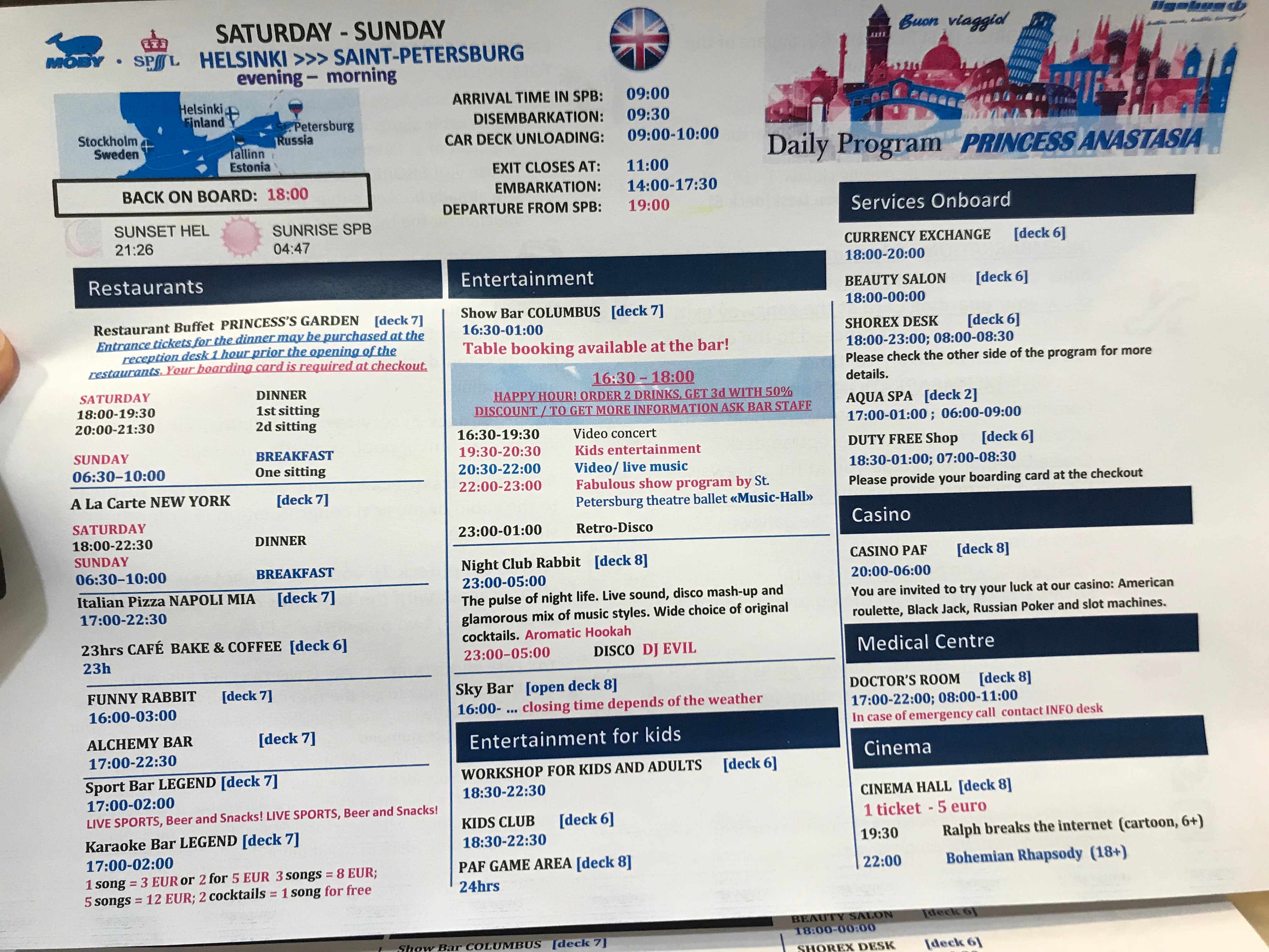 船上有卡拉ok、游泳池、SAP、夜店、餐廳、咖啡廳、酒吧、賭場、電影院、遊戲區、免稅商店,完全是應有盡有!!但就是沒有免費WIFI,不過好事就是從芬蘭出發的話去到甲板上其實都還是可以有收訊,等到傳開遠一點會斷掉,但之後航線會靠近愛沙尼亞,所以電信會收到愛沙尼亞的,我自己因為是法國電信,在歐盟都可以有網路,所以還沒到俄羅斯以前都可以收到!