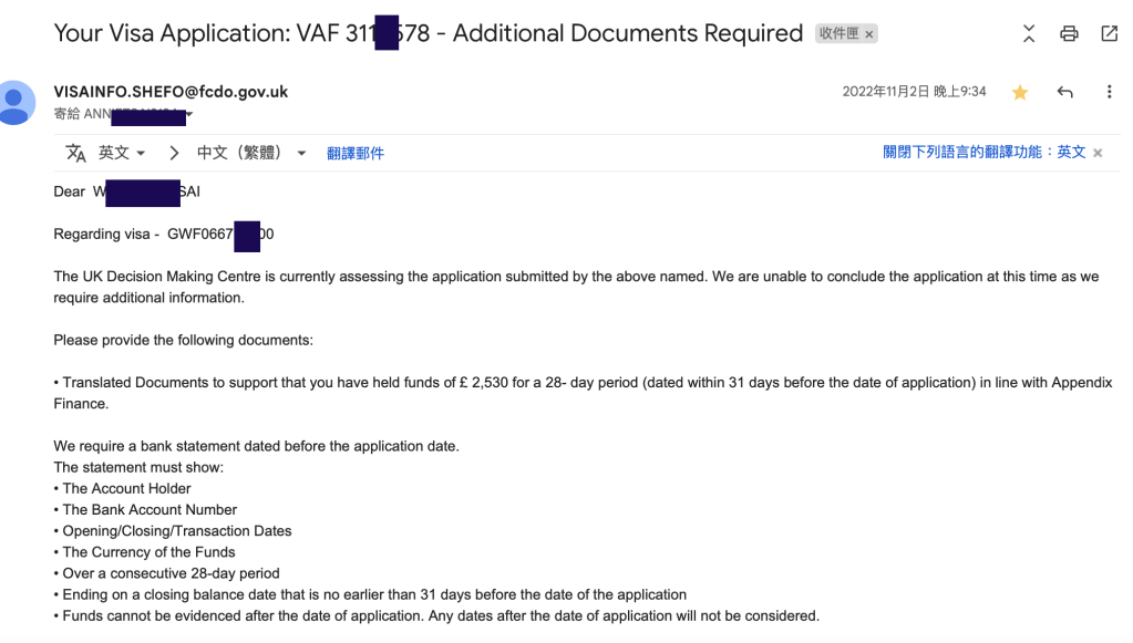 去VFS面試後,當時的人員非常好一直提醒我送件後的這幾天,要天天去看我的郵件,果然送件後的兩三天我就收到要補件的信件,如下圖分享給大家參考。